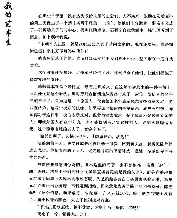 帝王生涯:记述三岁登基至1924年被逐出紫禁城的宫廷生活,揭示封建皇权的腐朽与末世皇族的困境;