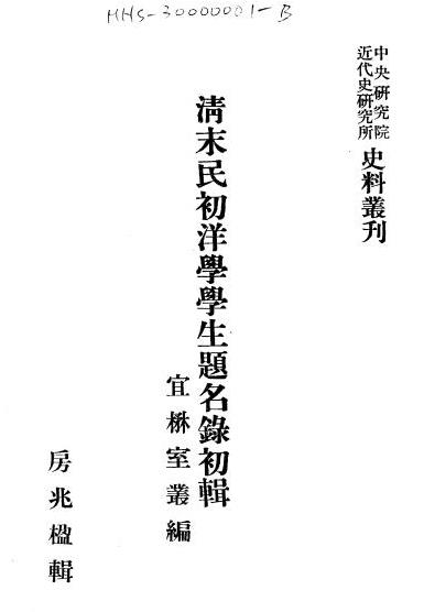 1962年中央研究院近代史研究所出版的图书《清末民初洋学学生题名录初辑》是中央研究院近代史研究所出版的图书,作者是房兆楹。
