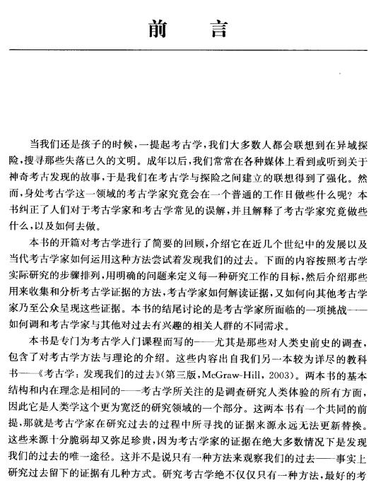 这本介绍当代考古学技术、方法和理论框架的简洁的导论性著作,遵循与作者另一本教材《考古学:发现我们的过去》同样的写作原则,但更为言简意赅。在不到300页的篇幅中,详略得当地全面介绍了考古学的方法和理论。说明案例和个案研究体现了新旧大陆考古遗址的时空平衡。本书还提供大量的学习帮助,包括考古区域的地图、广泛的例证、章介绍和摘要、每章结束时的深入阅读指南、词汇表、参考书目和索引等。