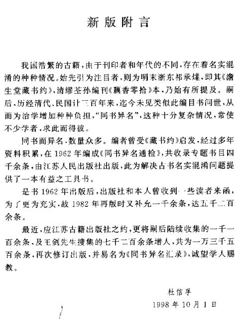 或有谓明人祁承煤《澹生堂藏书约》中,亦曾论及同书异名之书,但其举例不过数种,馀均为考据校雠之学.又有近人杜联喆所撰《丛书书目续编》,亦曾举同书异名,此专就丛书而言,而编者亦已备列之矣。余所以称是编为书林之创举,目录之别帜者以此。