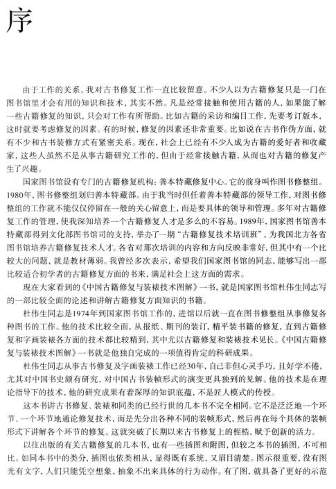 本书除了古籍修复的基础知识外,还介绍了古籍修复用纸、装帧形式、修复分解动作及敦煌遗书修复和字画装裱修复的常识以及技术分解动作,最后有拓片和书套(盒、囊匣)的制作。附录资料三种。作为全书最重要部分的《古籍修复技术分解动作》,用124个页面来逐一介绍了古籍修复的各个环节,清晰明确。仍保留李致忠序。