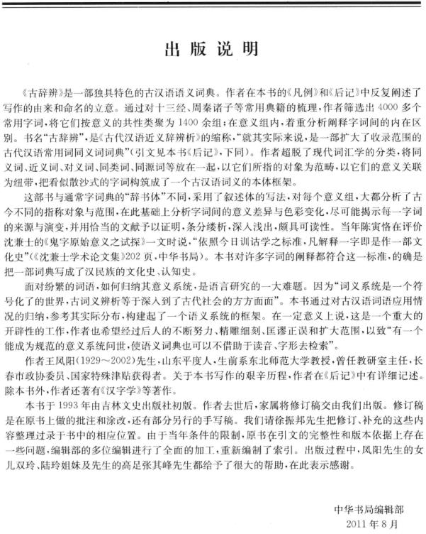 古辞辨(增订本)是一部独具特色的古汉语语义词典。作者在《古辞辨(增订本)》的《凡例》和《后记》中反复阐述了写作的由来和命名的立意。通过对十三经、周秦诸子等常用典籍的梳理,作者筛选出4000多个常用字词,将它们按意义的共性类聚为1400余组;在意义组内,着重分析阐释字词间的内在区别。书名“古辞辨”,是《古代汉语近义辞辨析》的缩称,“就其实际来说,是一部扩大了收录范围的古代汉语常用词同义词词典”(引文见《古辞辨(增订本)》《后记》,下同)。作者超脱了现代词汇学的分类,将同义词、近义词、对义词、同类词、同源词等放在一起,以它们所指的对象为范畴,以它们的意义关联为纽带,把看似散沙式的字词构筑成了一个古汉语词义的本体框架。这部书与通常字词典的“辞书体”不同,采用了叙述体的写法,对每个意义组,大都分析了古今不同的指称对象与范围,在此基础上分析字词间的意义差异与色彩变化,尽可能揭示每一字词的来源与演变,并用恰当的文献予以证明,条分缕析,深入浅出,颇具可读性。当年陈寅恪在评价沈兼士的《鬼字原始意义之试探》一文时说,“依照今日训诂学之标准,凡解释一字即是作一部文化史”(《沈兼士学术论文集》202页,中华书局)。《古辞辨(增订本)》对许多字词的阐释都符合这~标准,的确是把一部词典写成了汉民族的文化史、认知史。