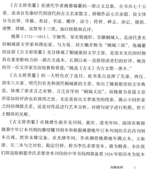 清桐城派大家姚鼐编纂的各类文章总集。全书共七十五卷,选录战国至清的古文,依文体分为论辨、序跋、奏议、书说、赠序、诏令、传状、碑志、杂记、箴铭、颂赞、辞赋、哀祭等十三类。所选作品主要是《战国策》、《史记》、两汉散文家、唐宋八大家及明代归有光、清代方苞、刘大櫆等的古文。书首有序目,略述各类文体的特点、源流及其义例。本书点校以李承渊求要堂本为底本,参校以康绍庸刻本和吴启昌刻本,遇有疑难处,根据通行各篇所出原书订正。