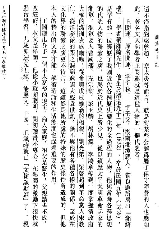 王闿运(1832——1916),初名开运 ,字壬甫,后更名“闿运”;初字纫秋,取自《离骚》“纫秋蘭以为佩”,友人称为“壬秋”,故五十后又改为“壬秋”, 故也可称壬甫。王氏号湘绮,学者称“湘绮先生”。“湘绮”之得名,据《湘绮楼记》说:取谢拟曹诗曰:“高文一何绮,小儒安足为。”余好为文,而不喜儒生,绮虽未能,是吾志也。《湘绮楼日记》多记交游,很有趣味.如《清史稿》本传载:“入都,就尚书肃顺聘。肃顺奉之若师保,军事多谘而后行。左宗棠之狱,闿运实解之。已而参曾国藩幕,胡林翼、彭玉麟等皆加敬礼。” 不过王闿运不满足于作幕僚,据《日记》光绪十年六月廿六日所载:阎丹初同游鄂,今当国;李少泉同游徽,今卫京师;彭雪琴同起湘、同居衡阳,今海防;张孝达同游京师,今督越。四人皆以轻材膺大任。其中的妒羡之情非常明显。
