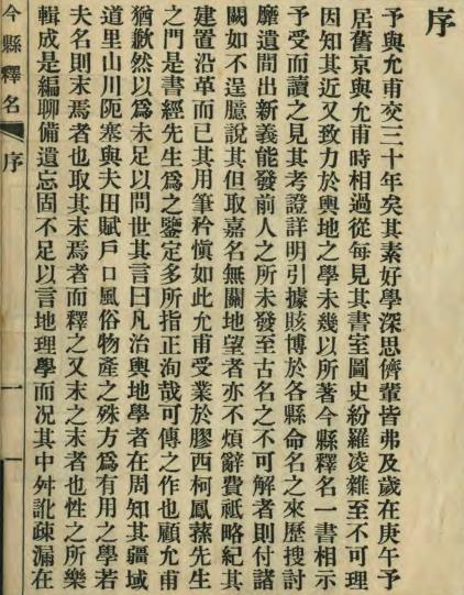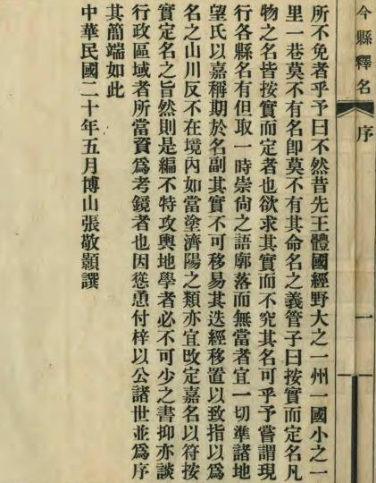 今县释名系吕式斌于民国二十年(1931年)著成,当年由北平恒和商行印行。内容分为六卷,铅印线装,一函两册,每页18行、每行28字,共计340页,合有17万字,书前有张敬颢、柯昌泗二序 自序及凡例四条,书后附有两页勘误表,正文以当时二十八省为纲,具体探讨了各县名称的由来。