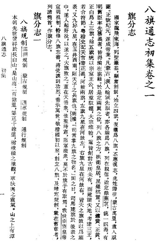 八旗通志初集,二百五十卷。鄂尔泰(1677-1745)等奉敕纂。鄂尔泰,西林觉罗氏,字毅庵,满洲镶蓝旗人。康熙至乾隆时的重要朝臣。康熙时举人,授侍卫,与田文镜、李卫并为胤禛心腹。雍正时,任云贵总督、军机大臣。乾隆时,与张廷玉等总理事务,进保和殿大学士,加至太保。雍正五年(1727)奉命领修此书,乾隆四年(1739)修成。书共二百五十卷,分志、表、传三部分。八志为:“旗分志”十七卷、“土田志”五卷、“营建志”三卷、“兵职志”八卷、“职官志”十二卷、“学校志”四卷、“典礼志”十五卷,“艺文志”十卷。八表为:“封爵世表”八卷,“世职表”二十四卷,“八旗大臣年表”八卷,“宗人府年表”一卷,“内阁大臣年表”二卷,“部院大臣年表”二卷,“直省大臣年表”五卷,“选举表”四卷。八传有:“宗室王公列传”十二卷,“名臣列传”六十卷,“勋臣传”十九卷,“忠烈传”十二卷,“循吏传”四卷,“儒吏传”四卷,“儒林传”二卷,“孝义传”一卷,“列女传”十二卷。是书的编纂是以八旗兵制为经,以八旗法令、职官、人物为纬。八志以事系人,记载八旗的建置、规制、驻防、旗地、府第衙署、官员职掌、教育礼仪、诏诰诗文等。八表以年系人,详列清初以来世爵的承袭和职官的擢黜。八传以人系事,介绍各色人的事迹。八旗制度是清太祖努尔哈赤在明万历二十九年(1601)至四十三年创立的军事社会组织,以后逐渐形成完备的制度,对清王朝的建立和几百年的统治起过不可低估的作用。是书根据大量史书、实录、档案、文书、封册、上谕、奏疏、诗文、各旗册籍等多种史料写成,不但对清代特有的这一制度和组织作了详细、系统地介绍,而且保存了不少现已失传清代书籍的内容,为清史的研究提供了难得的史料。本书有乾隆间的内府抄本和武英殿刻本,1985年东北师范大学出版社以殿本为底本,并参校他书对此书点校,出版了排印本。
