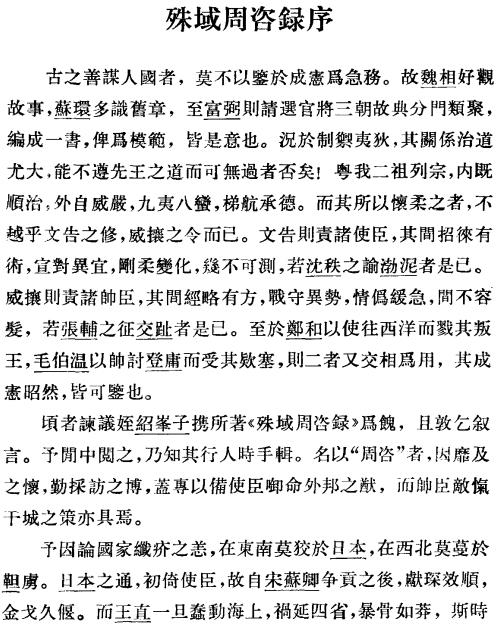 殊域周咨录,二十四卷。记载了我国东南西北边境及外国的情况,记述了明代出使外国史节的外交活动和航海方面的资料。