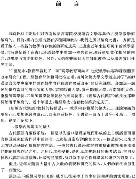 本书主要是针对西南地区高等院校学生编写的古代汉语教材。除了传统的文选和通论部分外,该教材扩大了教学内容的范围,增加了汉代以后各个时期的作品;吸收了近几十年来新的学术研究成果;为了帮助学生提高阅读古书的能力,增加了“古文献原文选”,使得学生在课堂上能直接接……