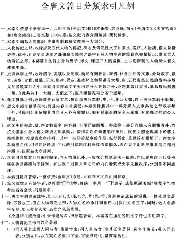 本索引共分3部分,其中包括:“认为传记之部”、“史事典制之部”和“艺文杂撰之部”等。它有1000卷,收唐及五代文献20025篇,加之后补的《唐文拾遗》、《唐文续拾》共有1088卷,共收文献23034篇,知名作者3533人。本索引即据以上三书编成。