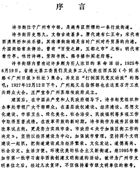 内容简介:诗书街位于广州市中部,是越秀区所辖的一条行政街道。诗书街历史悠久,文物古迹甚多。唐代建有仁王寺;宋代有西澳果桥和共乐楼,其南濠街南端是当时广州对外贸易的内港,外国商船常来停泊,曾有“百货之肄,五都之市”之称;明代有看竹亭、咏竹诗碑、紫阳书院、赐书楼和阁老府等。本志记述了诗书街的人口、经济、政治、文化等各方面发展与现状。