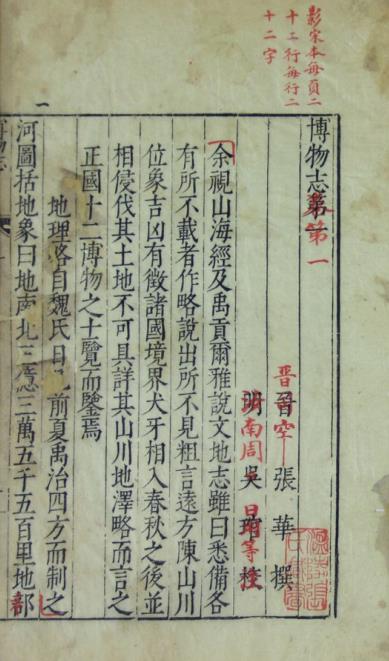 博物志,旧题西晋张华撰,宋周日用等注,明吴琯所刻《古今逸史》丛书本。张华(232-300年),字茂先,范阳方城(今河北固安)人,官至司空。据王嘉《拾遗记》记载,张华好观秘异图纬之书,采天下遗逸,撰成《博物志》四百卷,奏于晋武帝(265-290年),后芟为十卷,分类记载了地理、博物、禽兽、传记、神话、方术等,属志怪笔记小说。今本《博物志》应是原书散佚后,掇取诸书所引,杂采其它小说而成,有些条目未必出自张华原书。此本为明吴琯刻丛书《古今逸史》本,刊刻于万历年间(1573-1620年),清代藏书家黄丕烈曾用影宋本校勘。