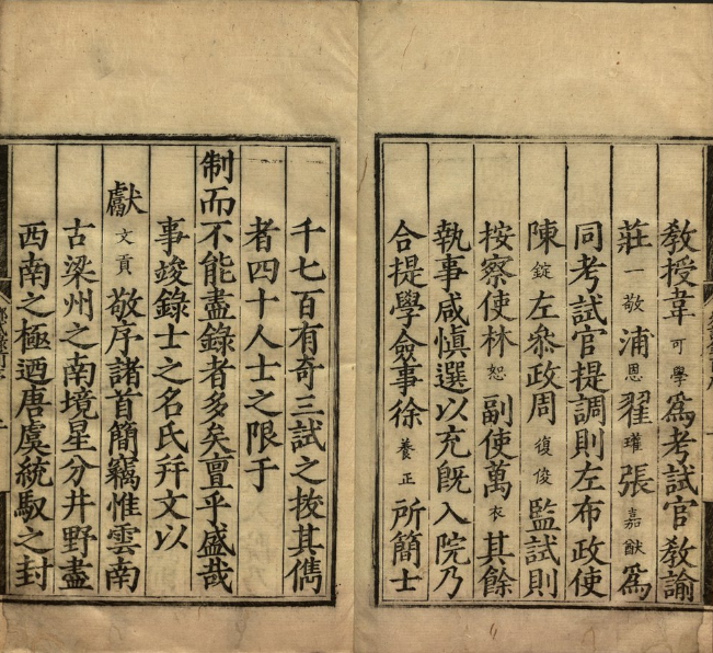 云南乡试录是一部明代嘉靖(1522-66)34年(1555)的云南乡试录刻本。中国古代科举制度最早起源于七上半世纪,经过了多次修改。科举制度在清末1905年停止实行。它的目的是训练和选拔人才为官员以形成一个有能的官僚体制在皇帝统治下来治理这个大国。科举制度试图鼓励真才男性而不考虑高门权贵或政治关系。这些明清科举考试录是很重要的资料,提供了当时的教育、文化、社会及政治各方面的情况。这种会试录一般有序、科题、各类考试官的名字和职衔,执行各种任务,如监临官、提调官、监试官、受卷官、誊录官、对读官及供给官等。会试可在地方,县府,省及京城举行,直到殿试。科题包括儒学四书、经济、治国、诗文、政治、国防、历史、法律、军事、自然、农业、及俗习。在中国明清时代科举制度是进入官场的通道。此书有1卷4册,录1555年举行的乡试。书内列有两位主试官,王文贡和韋可学。王文贡任县知,写序。韋可学写跋。