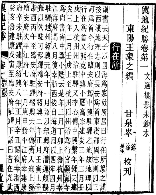 《舆地纪胜》是南宋中期的一部地理总志,王象之编纂,成书于南宋嘉定、宝庆间,200卷。自序谓:此书“以郡之因革,见于篇首,而诸邑次之,郡之风俗又次之,其它如山川之英华,人物之奇杰,吏治之循良,方言之异闻,故老之传说,与夫诗章文翰之关于风土者,皆附见焉。”后人以其详赡分明,体例谨严,考证极其核洽,誉为南宋全国性总志中最善者。