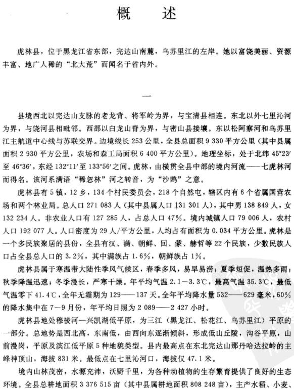 虎林县志是虎林县建国以来的第一本县志,其所载内容,对研究当地人文社会、经济等方面的情况具有重要作用。