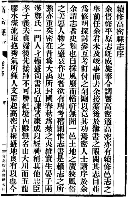 民国24年(1935),余有林、曹梦九主修《高密县志》。是书备记高密姓氏、地图、建置、典礼、民社等方面情况,并附高密县划分乡镇图、晏于墓图、郑公祠图等。高密市地处胶东半岛与山东内陆的结合部,为春秋时政治家晏婴、东汉经学大师郑玄故里。