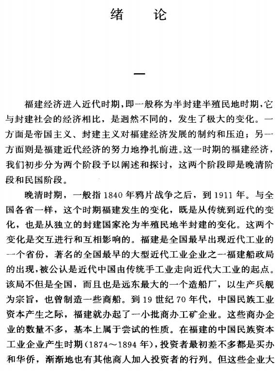 内容简介:福建经济进入近代时期,即一般称为半封建半殖民地时期,它与封建社会的经济相比,是迥然不同的,发生了极大的变化。一方面是帝国主义、封建主义对福建经济发展的制约和压迫;另一方面则是福建近代经济的努力地挣扎前进。这一时期的福建经济,我们初步分为两个阶段予以阐述和探讨,这两个阶段即是晚清阶段和民国阶段。晚清时期,一般指1840年鸦片战争之后,到1911年。与全国各省一样,这个时期福建发生的变化,既是从传统到近代的变化,也是从独立的封建国家沦为半殖民地半封建的变化。这两个变化是交互进行和互相影响的。福建是全国最早出现近代工业的一个省份,著名的全国最早的大型近代工业企业之一福建船政局的出现,被公认是近代中国由传统手工业走向近代大工业的起点。