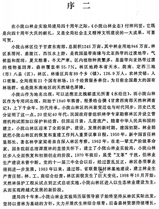 内容简介:小陇山林业实验局编纂《小陇山林业志》,是一件非常有意义的事情。它不仅在于可以真实记录小陇山林区开发、建设、保护、发展的历史轨迹,更重要的是还为后人留下了一部珍贵的历史资料。鉴往才能知今,明史催人奋进。《小陇山林业志》的问世,不仅弥补了小陇山林区开发建设以来有史无志的空白,而且更重要的是,以志书这样一种形式,真实记录小陇山林区的艰苦创业史,全面反映小陇山林区的发展壮大史,承前启后,继往开来,对逝者以告慰,生者以激励,来者以启迪。这是历史的重托,林业职工的期望,更是我们应尽的责任和义务,也是我们编《小陇山林业志》的初衷和目的。