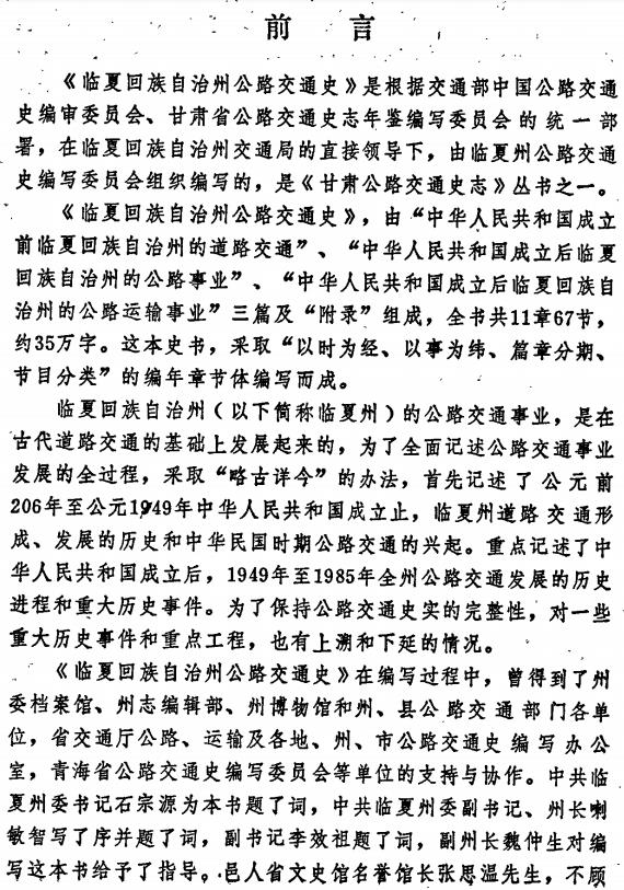内容简介:临夏回族自治州(以下简称临夏州)的公路交通事业,是在古代道路交通的基础上发展起来的,为了全面记述公路交通事业发展的全过程,采取“略古详今”的办法,首先记述了公元前206年至公元1949年中华人民共和国成立止,临夏州道路交通形成、发展的历史和中华民国时期公路交通的兴起。重点记述了中华人民共和国成立后,1949年至1985年全州公路交通发展的历史进程和重大历史事件。为了保持公路交通史实的完整性,对一些重大历史事件和重点工程,也有上溯和下延的情况。