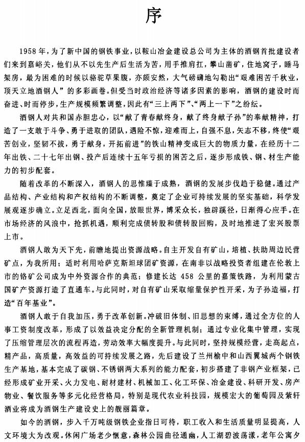 内容简介:《酒钢志》的编撰工作力求运用唯物主义历史观,准确、完整地记述酒钢的历史,客观反映酒钢建厂以来的人、物、事的变迁,将酒钢近五十年的发展历程全方位、多角度立体展现给读者。断限:上限始于1958年酒钢建厂,并对之前1955年发现镜铁山矿做延伸记述,下限断至2006年,对普通教育2007年移交地方时间作了记述。前后历史约50年。
