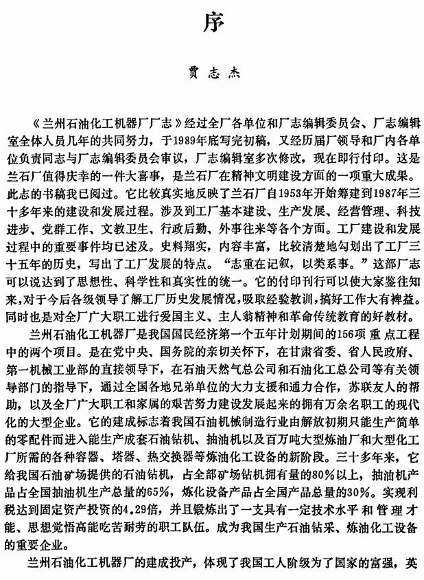 内容简介:《兰州石油化工机器厂厂志》经过全厂各单位和厂志编辑委员会、厂志编辑室全体人员几年的共同努力,于1989年底写完初稿,又经历届厂领导和厂内各单位负责同志与厂志编辑委员会审议,厂志编辑室多次修改,现在即行付印。这是兰石厂值得庆幸的一件大喜事,是兰石厂在精神文明建设方面的一项重大成果。此志的书稿我已阅过。它比较真实地反映了兰石厂自1953年开始筹建到1987年三十多年来的建设和发展过程。涉及到工厂基本建设、生产发展、经营管理、科技进步、党群工作、文教卫生、行政后勤、外事往来等各个方面。