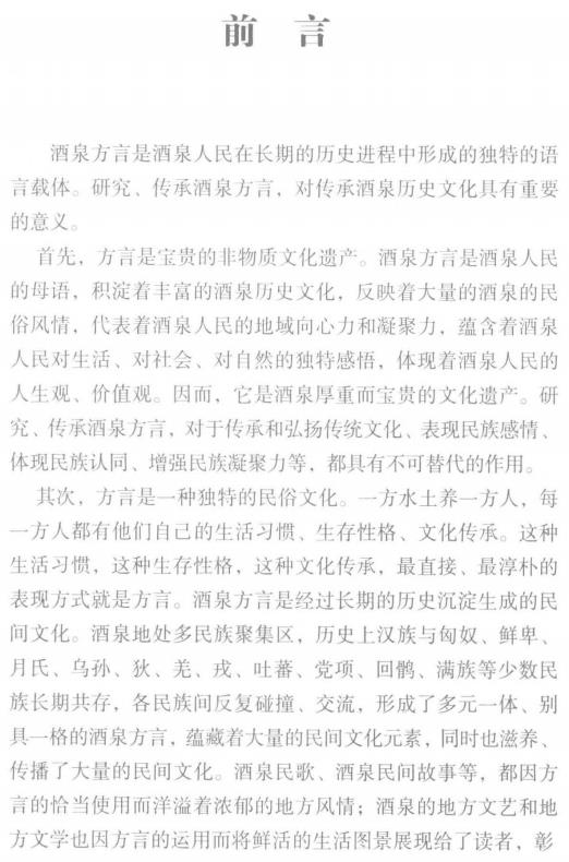 内容简介:酒泉方言是酒泉人民在长期的历史进程中形成的独特的语言载体。研究、传承酒泉方言,对传承酒泉历史文化具有重要的意义。首先,方言是宝贵的非物质文化遗产。酒泉方言是酒泉人民的母语,积淀着丰富的酒泉历史文化,反映着大量的酒泉的民俗风情,代表着酒泉人民的地域向心力和凝聚力,蕴含着酒泉人民对生活、对社会、对自然的独特感悟,体现着酒泉人民的人生观、价值观。因而,它是酒泉厚重而宝贵的文化遗产。研究、传承酒泉方言,对于传承和弘扬传统文化、表现民族感情、体现民族认同、增强民族凝聚力等,都具有不可替代的作用。