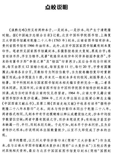 《滇黔志略:点校》所见有两种本子,一是刻本,一是抄本,均产生于清乾隆时期。据《中国地方志联合目录》记载,北京中国科学院图书馆、上海复旦大学图书馆藏有乾隆二十八年(1763年)刻本,云南省图书馆有抄本,贵州省图书馆有1966年油印本。此外,北京中国国家图书馆藏有刻本复印件。笔者所见国家图书馆藏刻本,系摄影胶卷放大复制,黑底白字;卷首有该书序,序言为楷书,尾署“乾隆癸未秋仲年同学弟枥园李俊序”,序末钤有篆书方形“李俊之章”及“枥园”印章两方;其后全书均为印刷宋体,每页由原文12面缩小组成,每面直排11行,每行20字,字旁有圆圈圈点;每卷各自分页,页数标号为阿拉伯数字,当为胶卷翻拍复印时重新编页而成;全书简装为1册,书末无一般刻本多有的校阅、刻版等类人名标署。而中科院刻本与国家图书馆刻本相关编目资料完全一致,二者系同本同源。民国年间,云南省图书馆自中国科学院图书馆传抄刻本副本回滇,成为当时该书在云南的仅见存留者。1964年,云南大学又藉云南省图书馆抄本复抄收藏。2004年,兰州大学出版社出版梁公卿总主编《中国西南文献丛书》,其第三辑《西南史地文献》中收录有该书“据传抄乾隆二十八年本影印”之本。刻本与传抄影印本同出于乾隆二十八年,两者格式相同,凡刻本中有字迹模糊难以辨认或遭侵蚀之处,抄本中均按字数留位空缺;两者中屡有脱误之字,而抄本笔误更多;有的地方甚至抄本缺漏一行、半行,而刻本则无缺。于此可知,刻本早于抄本问世,且为后者传抄之祖本;亦说明刻本出版数量极少,以至不久即促成了抄本的出现。