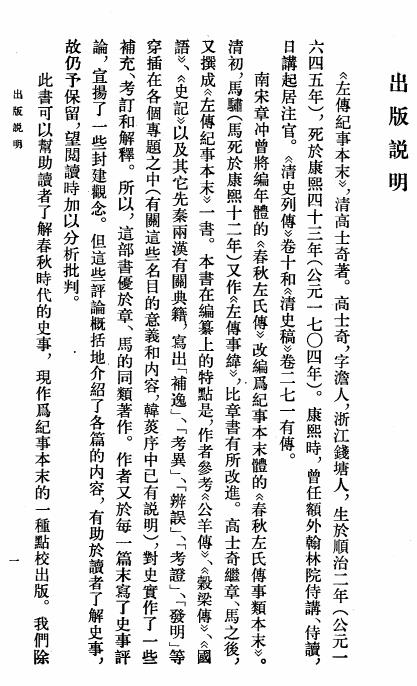 高士奇(1645—1704)作为清康熙年间著名学者,其编纂特点在于:将《左传》分散的编年记载按53个重大事件重组,如"周郑交恶"、"城濮之战"等,每事自成单元;保留原书精要,增补《公羊传》《穀梁传》等材料作为"补逸";附考证按语,体现清代考据学特色。