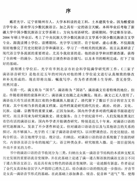 作者在认真梳理前人关于满语支诸语言的各种重要著述,并对三家子满语和相关语言进行认真细致调查分析的基础上,阐明了满语同以我国东北为中心的亚洲东部和北部多种阿尔泰及非阿尔泰语言的联系。