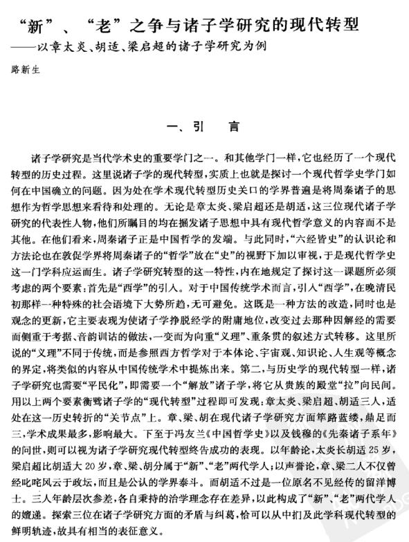 “新”、“老”之争与诸子学研究的现代转型——以章太炎、胡适、梁启超的诸子学研究为例