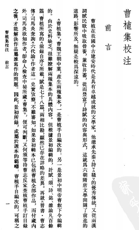 曹植在我国中古建安时代是具有卓越成就的文学家。他继承先秦《诗》《骚》的优秀传统,又从两汉词赋民歌中吸取营养,兼收并蓄,从而丰富了诗赋的内容与形式,这就为六朝隋唐文学开辟了前进的道路,影响所及,无疑是较为深远的。《曹植集》旧本的编次,是据文体异同汇为十卷的。《曹植集校注》,依据作品创作时期的先后分为建安、黄初、太和三卷。这样则有助于理解作者思想感情的变化历程,从而对作品取得较深的认识。