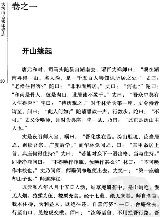 大沩山古密印寺志又叫作《大沩山志》,共八卷,卷一为开山缘起、山水、寺刹等,卷二为法系、功行表、法要,卷三为法要、佛事,卷四为塔墓、庄产等,卷五至卷八为各类诗文。
