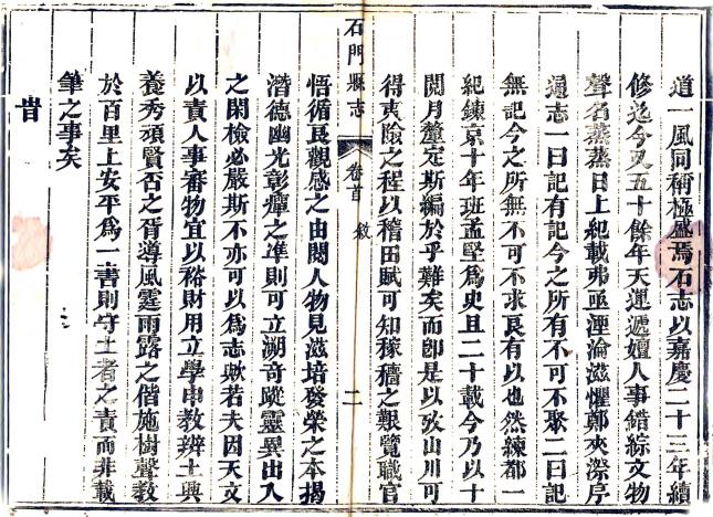 同治石门县志,十四卷首一卷,清林葆元、陈煊修,申正箓纂。林葆元,字树香,顺天大兴(今北京大兴县)人,同治五年(1866)任石门县知县。陈煊,字春皆,贵州湄谭人,进士,同治七年(1868)任石门县知县。申正箓,字旭亭,邑人,贡生,候选训导。石门县志创自明天顺间,久佚无考。清康熙时县令张霖、许湄先后搜辑,简略不备,均未授梓。至嘉庆二十三年(1818)县令苏益馨编纂成书,石门县始有志。兹篇则为续苏志而作。《石门县志》同治七年(1868)刻本。此志艺文所辑,多有关于地方建置之文词,广征博考故实。杂类之摭史纪闻,能引史以补阙疑,并订其传闻异词之说。纪闻甚鲜怪诞不经之事。辨伪之末,有石门名考一篇,引证详实,可补沿革之未尽。综观全书,颇能正旧志之讹伪,补其疏漏,可谓佳作。有同治十三年(1874)补刻本和民国二十五年(1936)铅印本。