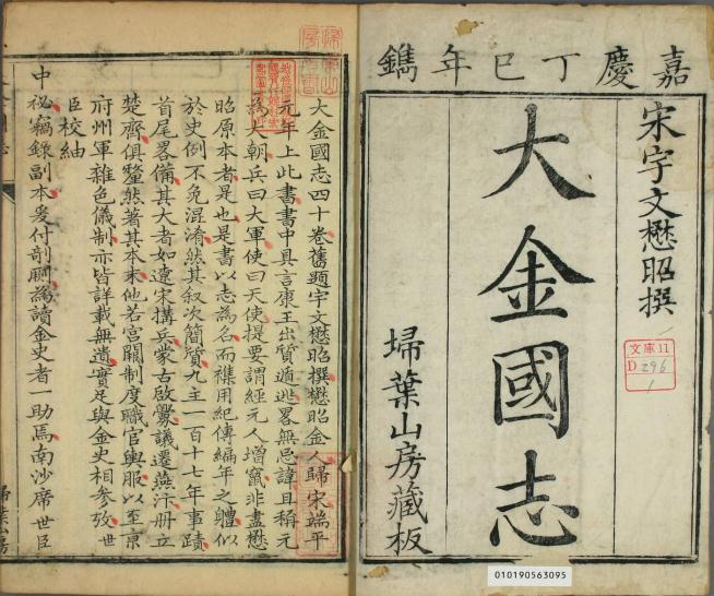 大金国志,题宋宇文懋昭撰。四十卷。前有进书表,末署端平元年(1234)正月十五日(此月十日金亡)。作者自称“淮西归正人”,但对宋事一切不讳。开国功臣传一卷不过十三人,皆寥寥数语;文学翰苑传两卷多至三十二人,系删削元好问《中州集》小传而成。又称元兵为“大军”,称元朝为“大朝”,称元使为“天使”,颇似元人著作。末卷《许元宗奉使行程录》取自徐梦莘的《三朝北盟会编》。当是杂采诸书,伪托宇文懋昭,或宇文原著经后人增补。书中详载一百十七年金国事迹,首尾完整,所记天文、地理、京城、陵庙、仪卫、车骑、舆服、符印、百官、皂隶、考试、科举、屯田、兵刑以及楚齐事迹、任免诏诰、宋金誓书等,多为他书所不载,当另有所据,可与《金史》相参考。