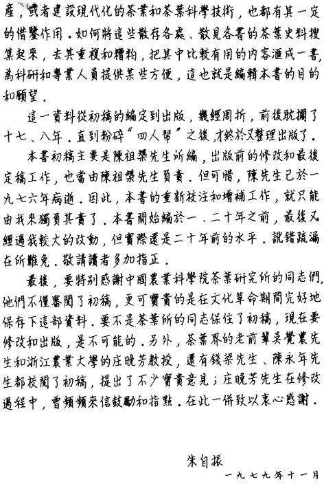 中国茶叶历史资料选辑是一本资料集。全书45.6万字,1981年11月由农业出版社出版。选录自先秦至民国期间,除方志以外的史籍中的有关茶叶资料。分为三部分:“茶书”部分收入著作58种,“茶事”部分收入451种书籍中的资料,“茶法”部分(包括茶税和茶与政策等)收入67种著述中的有关资料。资料间有编者附加的属于校勘性质的、提供意见或评论性质的按语。是一部资料较为丰富的古代茶史参考书。前有朱自振撰写的序、凡例、导言。作者朱自振,茶史专家。长期从事茶史研究,论证巴蜀是我国茗饮文化的摇篮,为发掘和整理我国茶史文献,推进茶文化研究作出重要贡献。