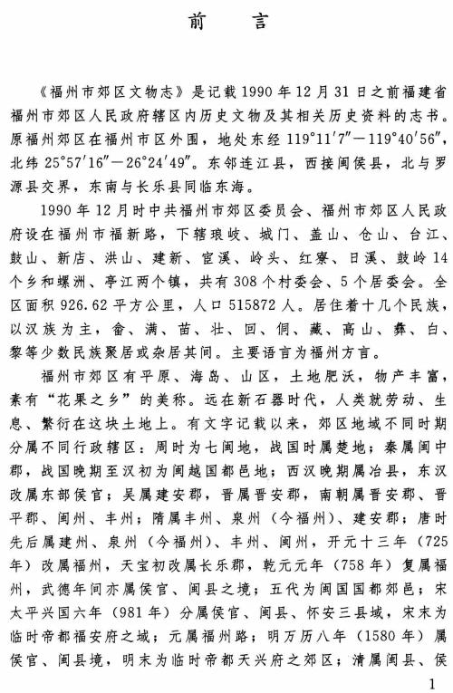 内容简介:本书记载1990年12月31日之前在原福州市郊区人民政府行政区域(1990年12月31日时的辖区)内已发现的人类社会活动中遗留下来的具有历史、艺术、科学价值的遗迹和遗物,及与之相关的人物或历史事件。篇目系根据《中华人民共和国文物保护法》有关规定,参照文化部文物事业管理局(1985)关于组织编印《文物古迹分布图册》的通知、福建省地方志编纂委员会(1985)《文物志》篇目、福建省文化厅(1989)《福建省志·文物志》编纂工作方案,结合福州郊区的实际情况而制定。编纂人员:黄荣春