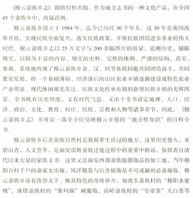 内容简介:本志书的写作突出区域性与民族性,其大事记得时空设定始于1984年10月福安穆云畲族乡设立三十周年的经济、政治、文化、社会、自然生态全貌。《穆云畲族乡志》的面世,必将进一步激发人们的思乡之绪,爱乡之情,建乡之志。让我们同心同德,携手合作,为建设“百姓富、生态美”的富饶多彩的美丽穆云,添砖加瓦,再创辉煌!编纂人员:蓝炯熹