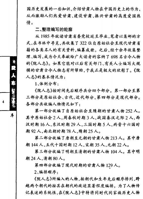 内容简介:《陇人志》按时间先后顺序共分四个部分。第一部分至第三部分是原始社会、古代、近代部分,第四部分是现代部分。各部分共收编人物情况如下:第一部分收编了自原始社会至隋朝的甘肃人物252人。其中原始社会2人,周春秋时期3人,战国秦汉之际2人,西汉时期16人,东汉时期29人,三国时期5人,两晋十六国时期92人,南北朝时期78人,隋朝25人。第二部分收编了唐朝至元朝的甘肃人物213人。其中唐朝144人,五代十国时期12人,宋朝35人,元朝22人。第三部分收编了明朝至清朝的甘肃人物104人。其中明朝24人,清朝80人。第四部分收编了现代时期的甘肃人物129人。编纂人员:姚志忠
