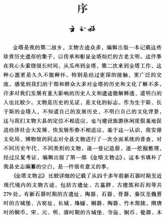 内容简介:金塔是我的第二故乡,文物古迹众多,编辑出版一本记载这些珍贵历史遗存的集子,以传承和彰显金塔灿烂的古老文明。这件事在我心头萦绕很长时间。从瓜州到金塔,第二次来到金塔工作,这种心愿更是久久不能释怀。特别是经过更深的接触,更广泛的交流,感觉到我们的干部和群众大多对金塔的历史和文化了解不多,许多对我们发展有重大影响的历史人文和遗迹能解释透、道明白的人也比较少。文物是历史的见证,是文化的标志。作为生于斯、长于斯的金塔人,不知道自己的发展历史,不明白自己的文化背景,这与我们文物大县的定位不相适应,也与建设旅游休闲度假基地促进经济社会大发展、快发展形势不相适应。基于这一认识,我安排文化局、博物馆的同志对全县文物进行了一次全面系统的普查,对不同历史年代、不同类别的文物,逐一登记造册,逐一挖掘整理,经过反复考证,编辑出版了第一部(金塔文物志》。这本书填补了我县史志编纂的空白,是一件很有意义的事。